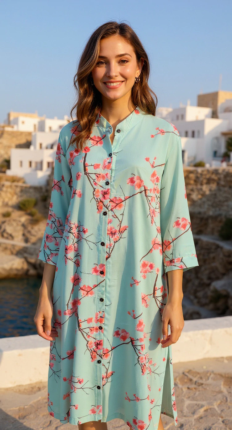 El clásico camisero largo 100% algodon, ahora en estampa exclusiva Cerezos. Un diseño elegante y colorido que aporta frescura a tu guardarropa. Gracias a su excelente caída, suavidad y practicidad, podés usarlo como vestido o como abrigo liviano abierto sobre prendas básicas.