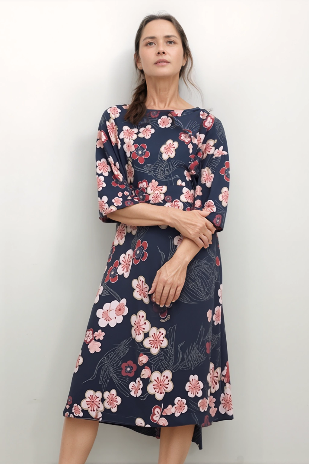 Su cuello bote, las mangas 3/4 y los tajos laterales le suman un aire moderno y relajado, mientras que el cinturón de la misma tela te permite ajustarlo a tu gusto y realzar la silueta.
